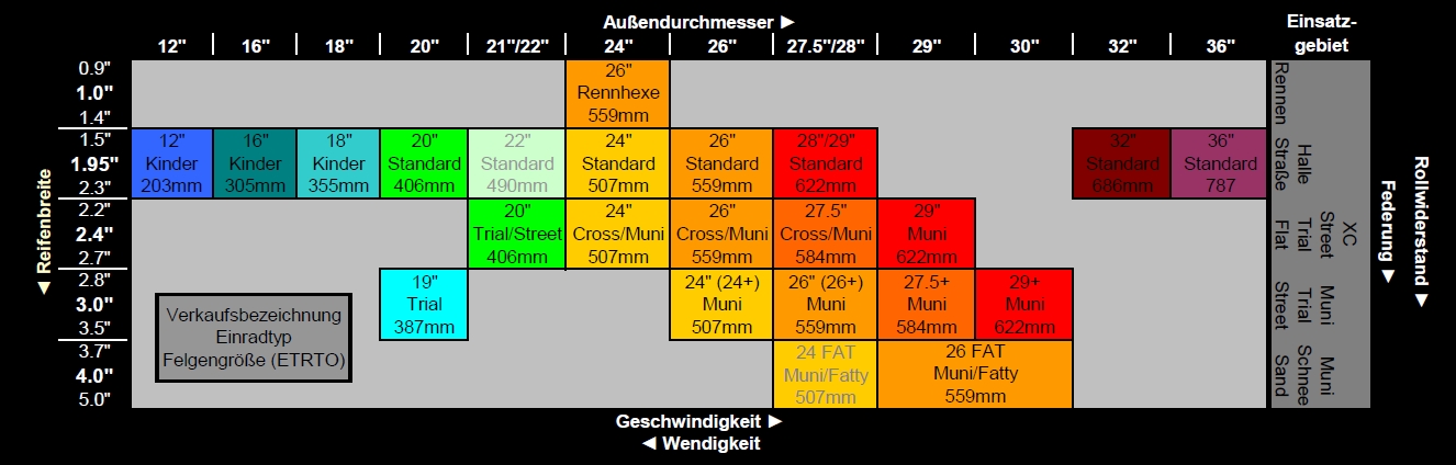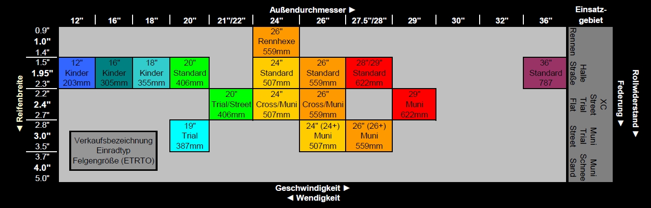 Die nachfolgende Übersicht zeigt die typischen etablierten Rad- und Reifengrößen. Schön zu erkennen: ein und der selbe Felgendurchmesser (gleiche Farbe) kann die unterschiedlichsten Außendurchmesser haben, je nach Reifenbreite. Und ein gleicher Außendurchmesser lässt sich durch unterschiedliche Reifenbreiten mit unterschiedlichen Felgengrößen erreichen, mit mehr oder weniger Federung.