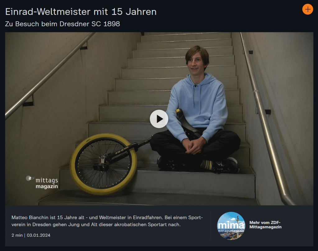 Ein Team des ZDF Mittagsmagazins besuchte am 5. Dezember 2023 die Einradfahrer des SV Motor Mickten, um einen Beitrag über Matteo Bianchin zu drehen. Dabei begleiteten sie die Tiger und Löwen beim Hockeytraining und führen Interviews mit Matteo und Trainer Ole. An diesem Mittwoch wurde der Beitrag schließlich ausgestrahlt.