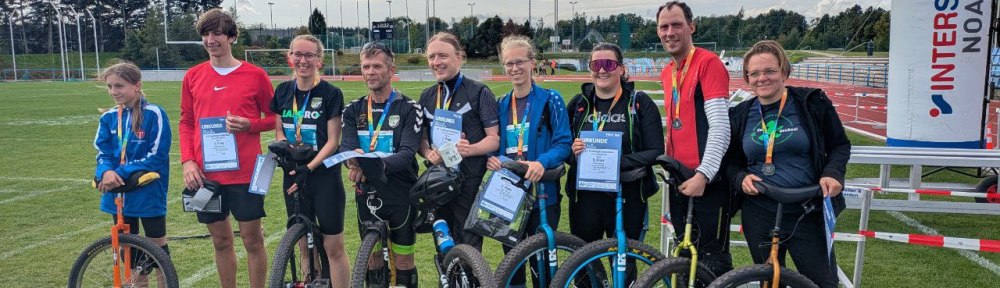 Am Samstag starteten bei bestem Wetter 9 Einradfahrer beim 10-km-Einradrennen des 42. Freiberger Herbstlaufes. Über zwei Runden à 5 km auf einer angenehm schnell zu fahrenden Mischung Asphalt, Wald- und Feldwegen, Acker und Tartan ging es um das Stadion „Platz der Einheit“ und durch den Freiberger Stadtwald.