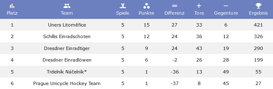 Im Hockey wurden drei Turniere, A, B und C gespielt, um verschiedene Skill Level abzubilden. Die Dresdner Einradlöwen traten im B Turnier an. Im Turnier spielten 19 Mannschaften, aufgeteilt auf zwei Gruppen. In den Gruppenspielen konnten die Löwen fünf Spiele für sich entscheiden und mussten nur drei Niederlagen einstecken. Im Finalspiel um Platz sieben bezwangen sie dann die UnicycleRS vier zu zwei und erreichten damit Platz sieben.